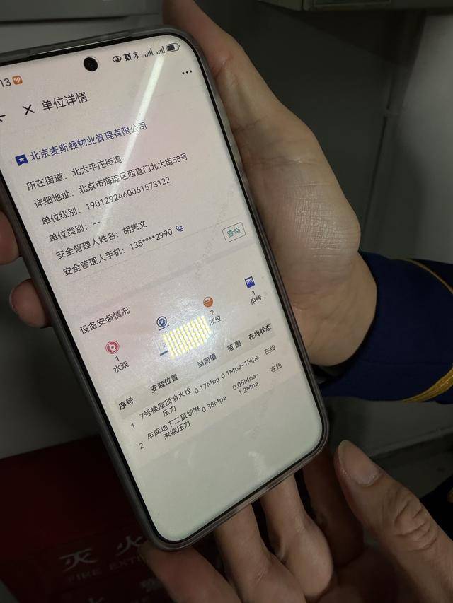 中控室是建筑的“消防大脑”。来到小区中控室,魏然首先按照“双人24小时值班值守”的要求,查看了两人的职业资格证书,并问询应急处置流程。“这是消防部门推动单位安装的‘三水一电’消防物联网感知终端,通过常态化数据收集分析,可以日常监测建筑的消防水系统和电气系统。”魏然接着又查看了中控室的另一个设备,“我们监督员的手机里都安装了APP,不仅可以实时查看诸如喷淋、消防栓的水压等数据,一旦出现异常,还能收到报警。”