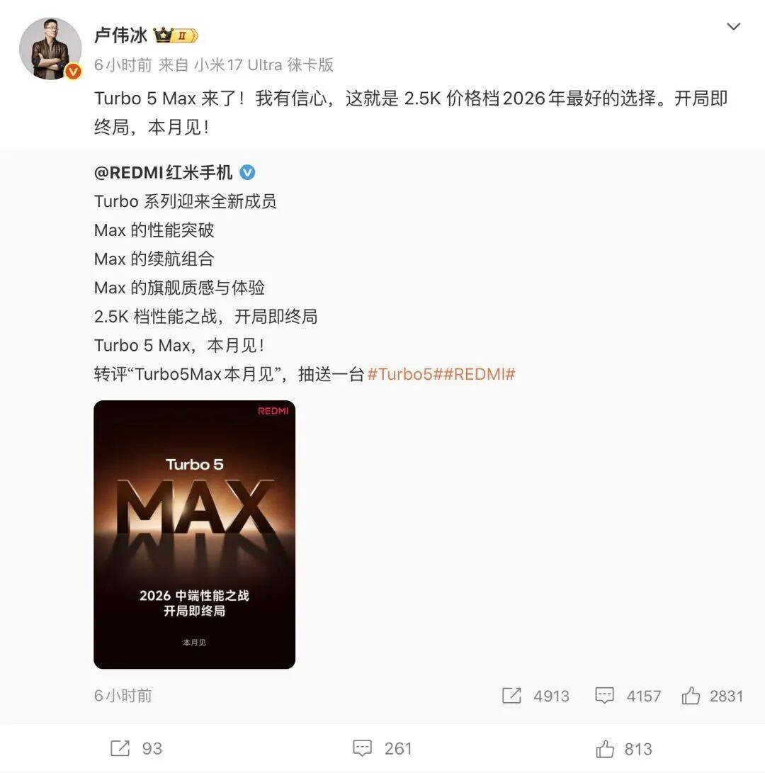昨天,REDMI 手机释出即将发布的新机「Turbo 5 Max」的全新预热海报。小米集团合伙人、总裁卢伟冰表示「我有信心,这就是 2.5K 价格档今年最好的选择」,强调该机在性能、续航与质感上均将提供「Max」级体验。