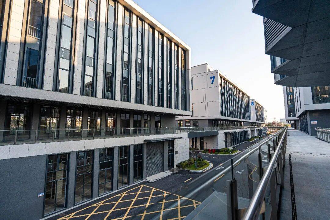 这里空间规划很用心,总建筑面积约8.7万平方米,共有8栋车间和1栋综合楼。特别的是,9栋建筑的二层全部用连廊打通,实现人车分流,既安全又方便企业之间走动交流。