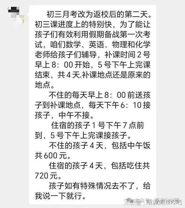 据家长提供微信聊天截图显示:该教师张某把补课计划分为年前和年后两阶段:年前从2月8日(腊月二十一)至2月14日(腊月二十七),年后从2月22日(正月初六)至2月28日(正月十二),总计14天。费用标准为:不吃饭1900元、只吃中午饭2100元、住宿2500元。学生需自备学习资料和生活用品,包括各科试卷、水杯、饭盒及洗漱用品。