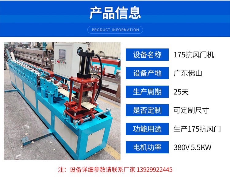 抗风门设备,别名:卷帘门设备/卷闸机/卷闸门机机械,是一款成熟的冷弯成型机械。一般使用彩涂板/镀锌板/不锈钢卷带作为原材料,一般国内通用175mm和125mm宽的原材料,成型尺寸可定制。抗风门机具有高效稳定的特点,其操作简单,易于操作。通过数控液压切断,能高效生产。佛山页南恒机械厂是专业生产卷帘门机械设备的厂家,开厂30年,质量好,技术成熟。