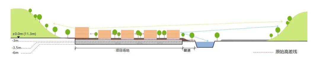 项目将整个场地统一抬升至11m,获得更好的景观视野与私密性。总裁会馆与碧道自然顺接,与大自然生态产生更亲密接触。