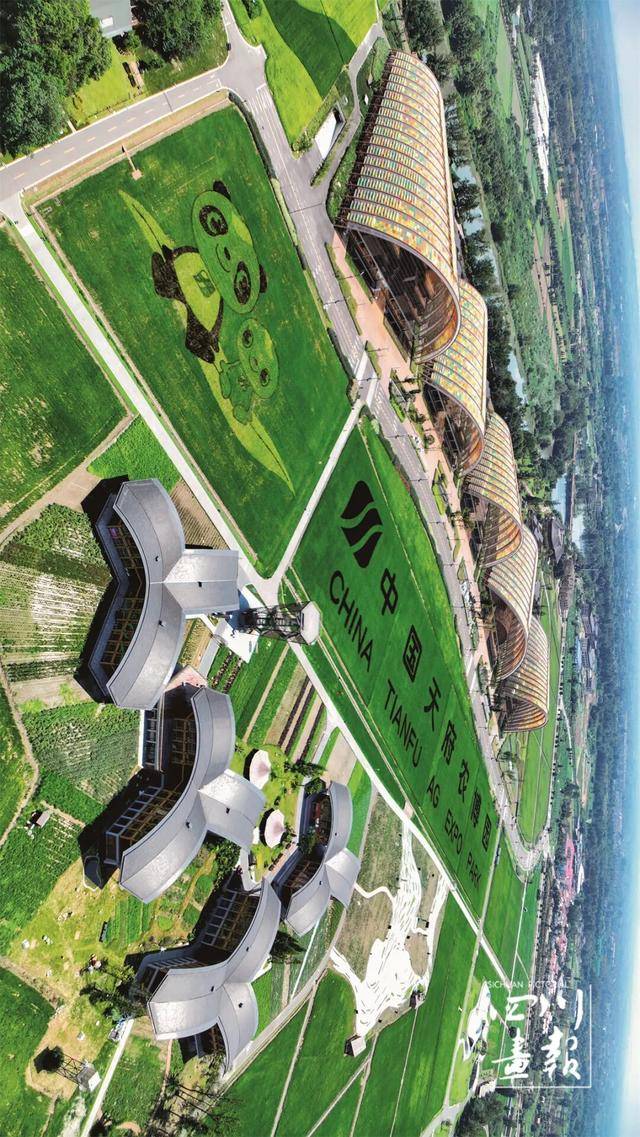 当你俯瞰新津的天府农博园,一定会被视线里的大地艺术震撼:绿意盎然的田地里,深紫、深绿、浅绿、嫩黄等颜色的彩叶稻勾勒出可爱的吉祥物——宝宝、墩墩,这源自成都稻作文明起源——位于新津的宝墩遗址。