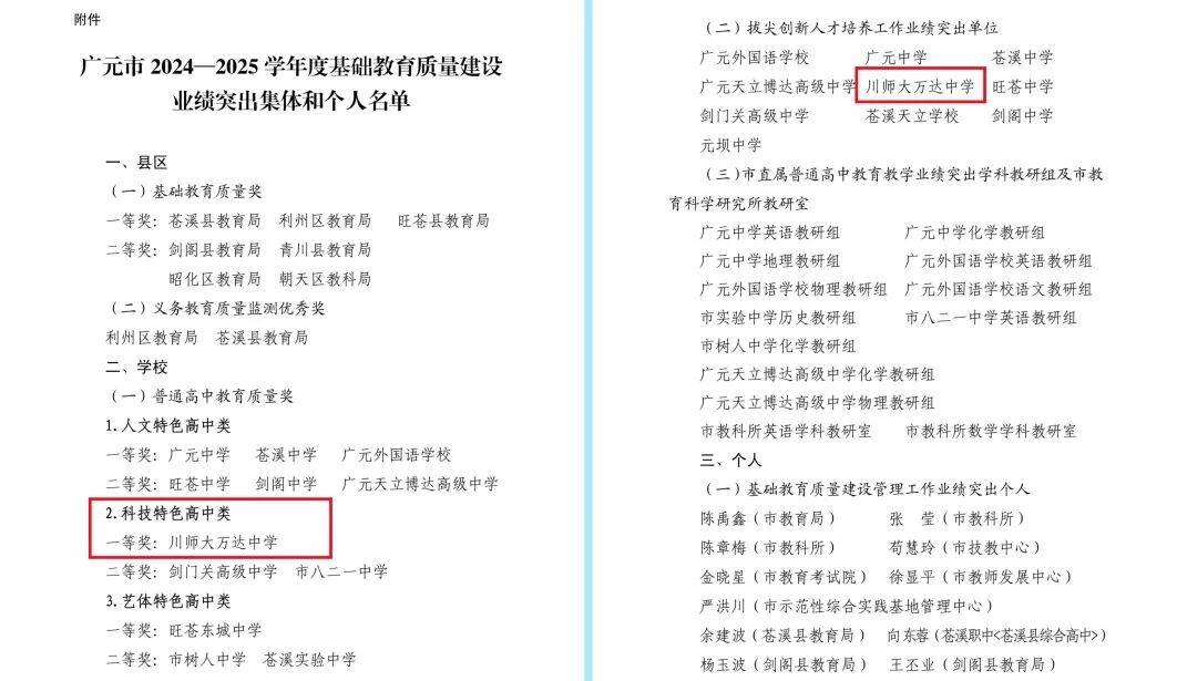 万中荣耀 万达中学荣获广元市2024—2025学年度普通高中教育质量一等奖