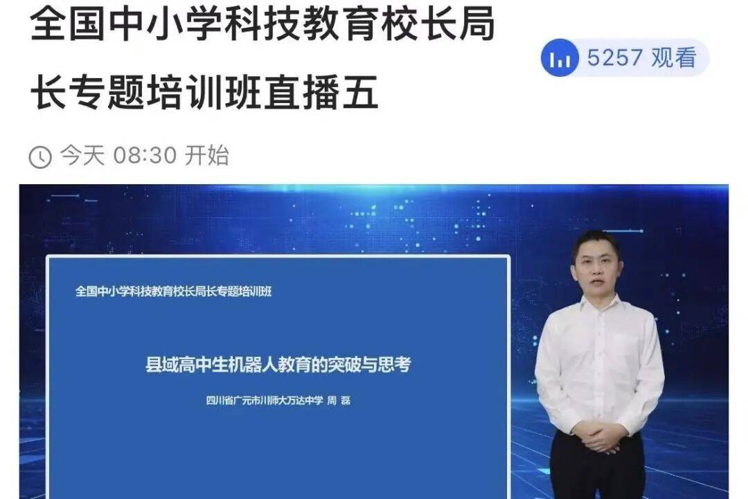 10月26日上午9时,教育部全国中小学科技教育校长局长专题培训班主会场屏幕上,呈现出来自四川广元的实践案例——我校周磊老师主讲的《县域高中生机器人教育的突破与思考》,入选教育部全国中小学科技教育十大典型案例。