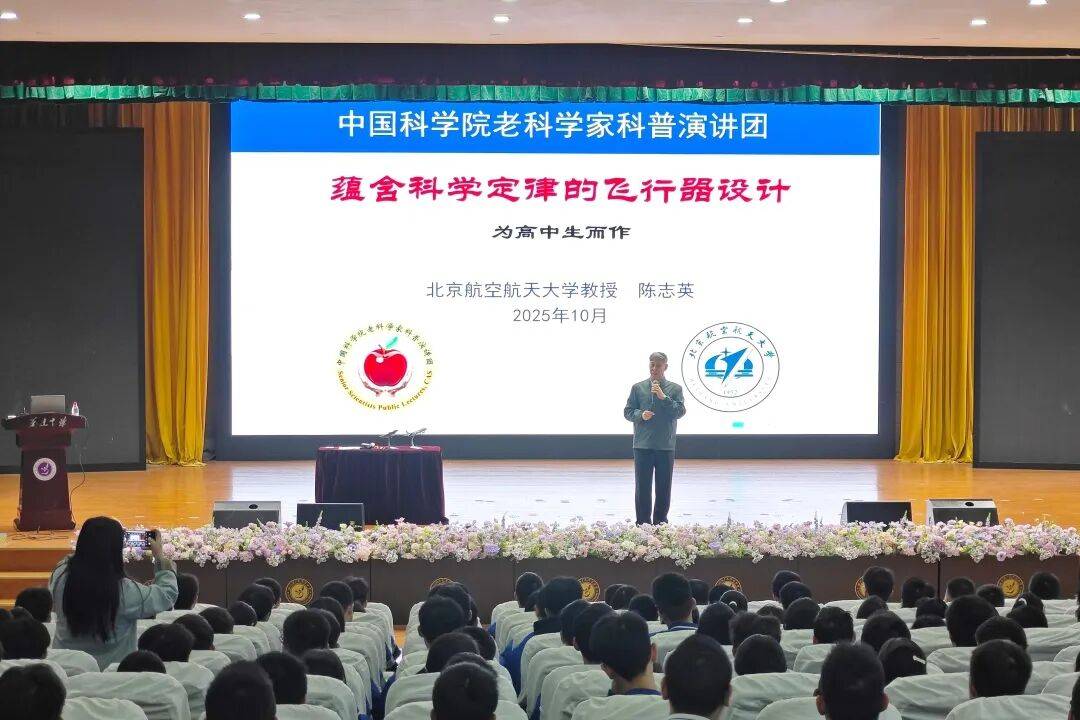 10月21日下午,万达中学迎来了一位特别的客人——中国科学院老科学家科普演讲团成员、北京航空航天大学陈志英教授。作为我国航空发动机领域的资深专家,陈教授以其四十余年的科研积淀,为我校学子带来了一场精彩纷呈的《蕴含科学定律的飞行器设计》专题讲座。