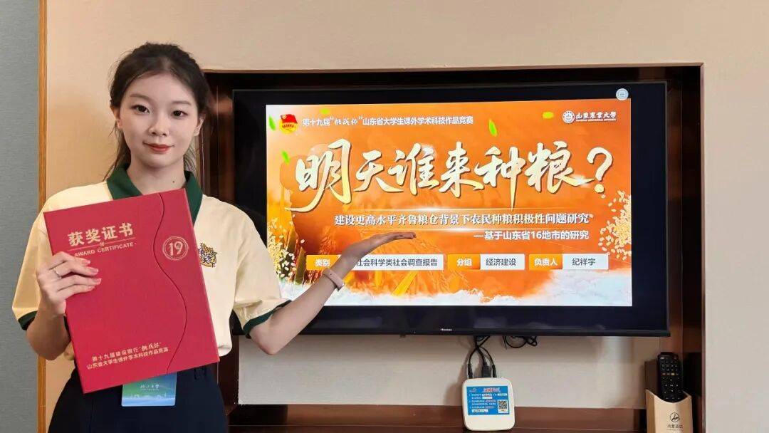 胡一宁,女,党员,经济管理学院2022级农林经济管理专业本科生。担任班长、院学生会主席团成员。综合测评成绩位列年级前1%,四十余门课程达90分以上,推免成绩专业第二,现已推免至山东农业大学硕士研究生,获得双创实践类与学业工作类等荣誉40余项。作为核心成员在第十九届“挑战杯”全国大学生课外学术科技作品竞赛主体赛中斩获特等奖,实现学校在该顶级赛事中“零的突破”。累计荣获山东省大学生科技节二等奖、“三创赛”“互联网+”校赛一等奖等科创及创业类奖项10余项。担任SRT大学生创新训练项目负责人,并以独立作者身份发表论文一篇,获评“创新创业先进个人”。作为德州市禹城市乡村驿站负责人,带领团队走访调研3省12市18县,基于一手调研数据撰写五万余字调研报告,报告入选三下乡社会实践“财经报国青年力行”国家级立项,为激发农民种粮积极性提供可复制、可推广的“齐鲁样板”,事迹被齐鲁晚报、大众网等多家主流媒体报道。