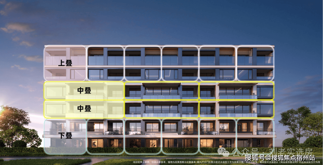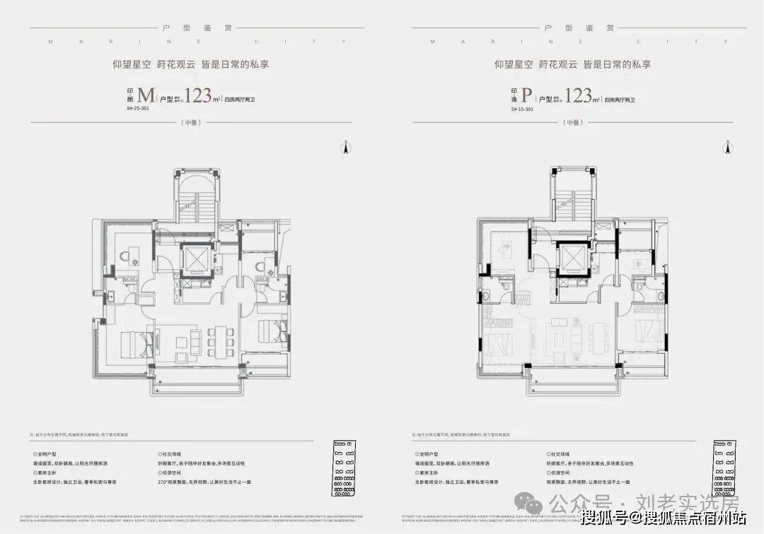 而中叠(建面约123㎡)则集便利与尺度于一身:不仅配备独立电梯厅,更以约13.4米南向面宽、约6米宽厅及南北双270°转角飘窗,营造出宽幕视野与通透空间,体感媲美整层大平层,实得率几近“满格”。