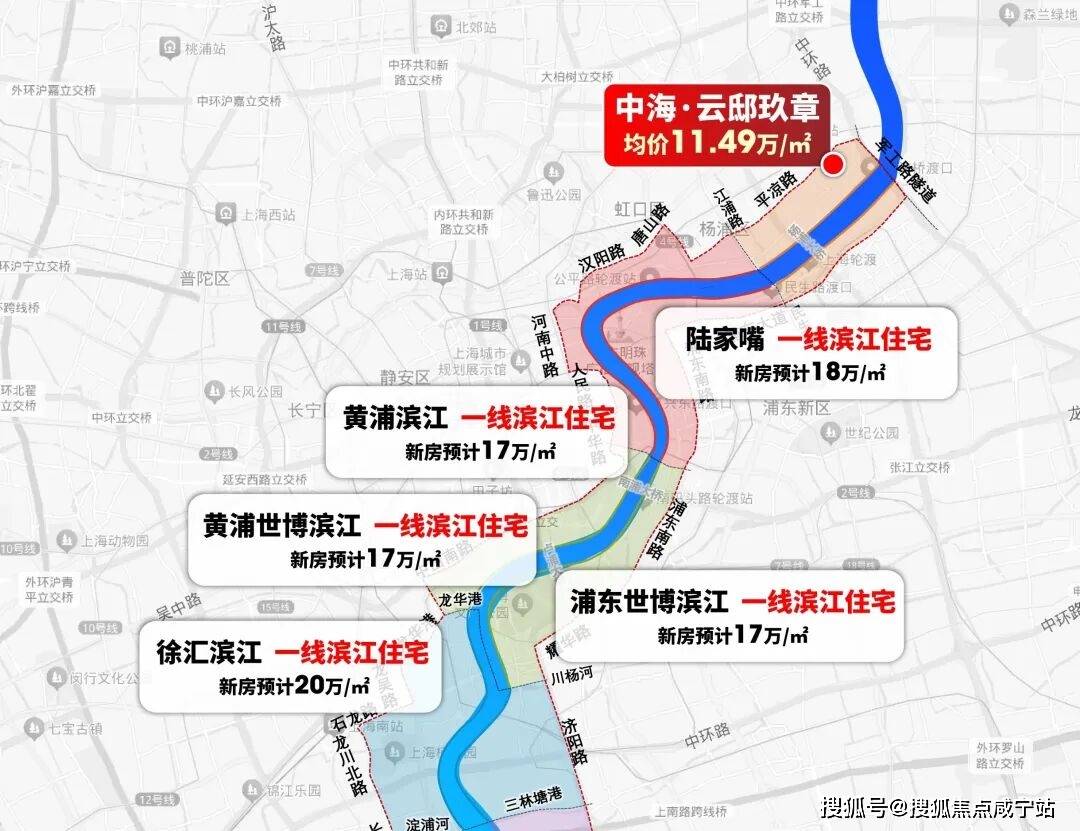 相较于同级别内环滨江段新盘价格梯度,黄浦滨江17万+/㎡、徐汇滨江20万+/㎡,中海·云邸当前均价11.49万/㎡的价格存在不小的优势。