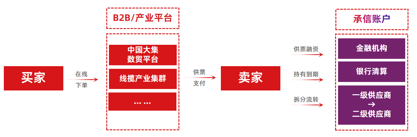 数字贸易平台:面向B2B平台、产业互联网平台及内外贸交易场景,首创“承信账户”,将传统应收账款转化为可拆分、易流转、可融资的供应链票据。平台与中国大集、易缆网、新明辉等36家产业和科技平台深度合作,正在积极服务全国多地产业带的贸易场景。如通过将承信账户嵌入中国大集平台收银台,依托真实订单信息,实现线上支付、自动对账与融资的闭环管理,将非标应收应付转化为标准化票据资产,为产业链构建高效可信的交易闭环。